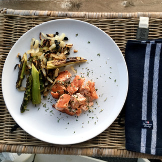Spargel und Lachs anrichten. Fein gehackte Kräuter darüber streuen.